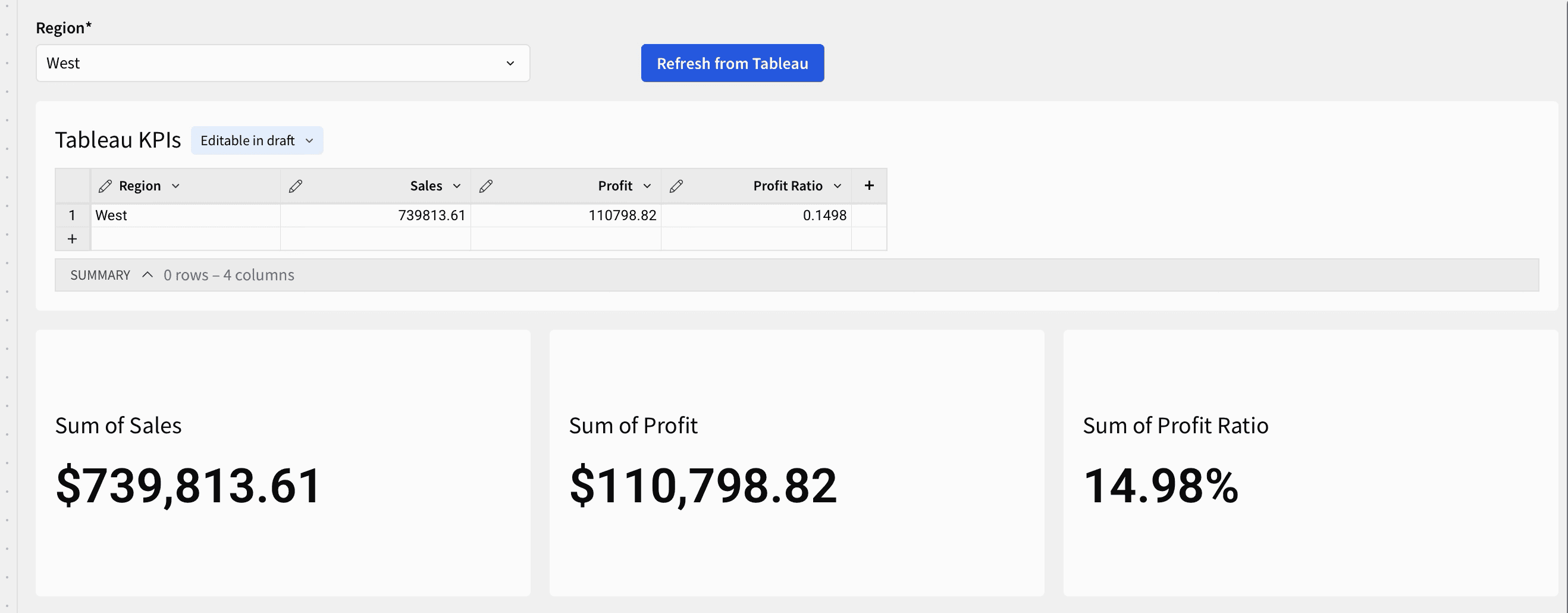 Pick a region. Click Refresh. The KPI tiles update with Tableau's numbers for that region.